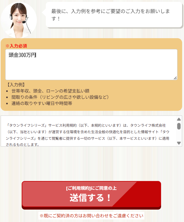 入力例にある通り、間取りの条件や年収などを記載すると、より伝わりやすくなります。